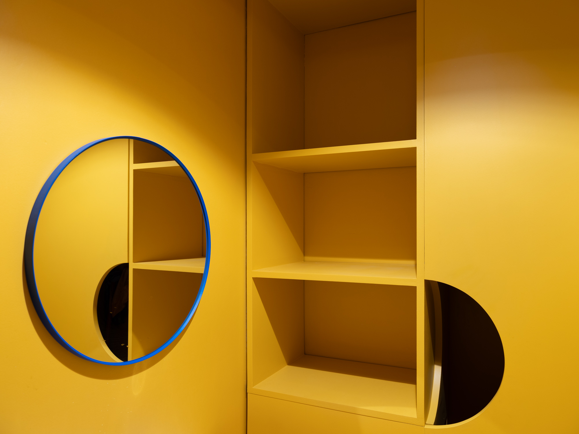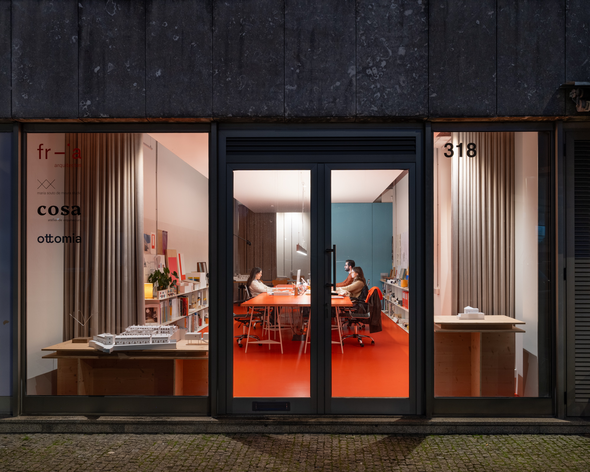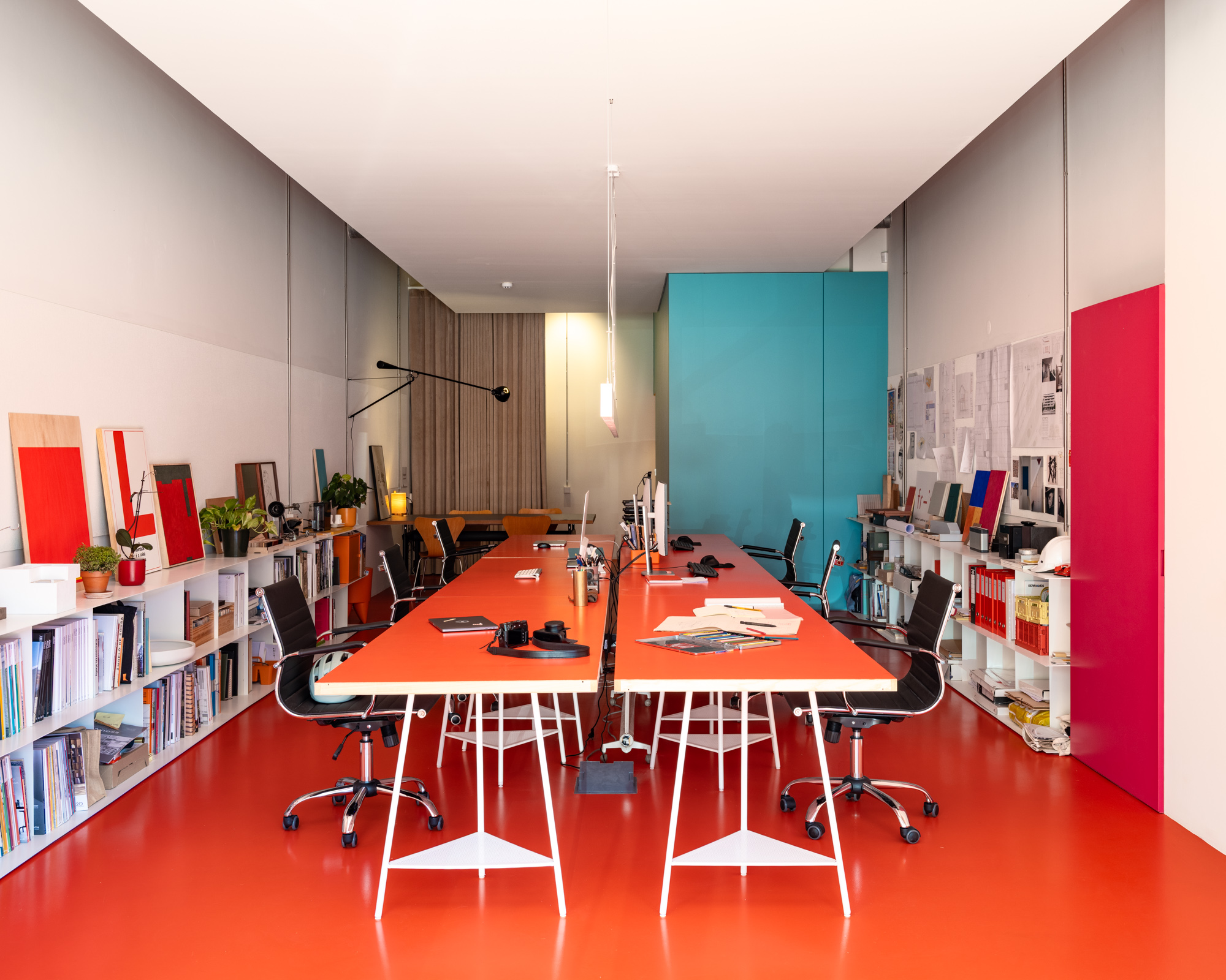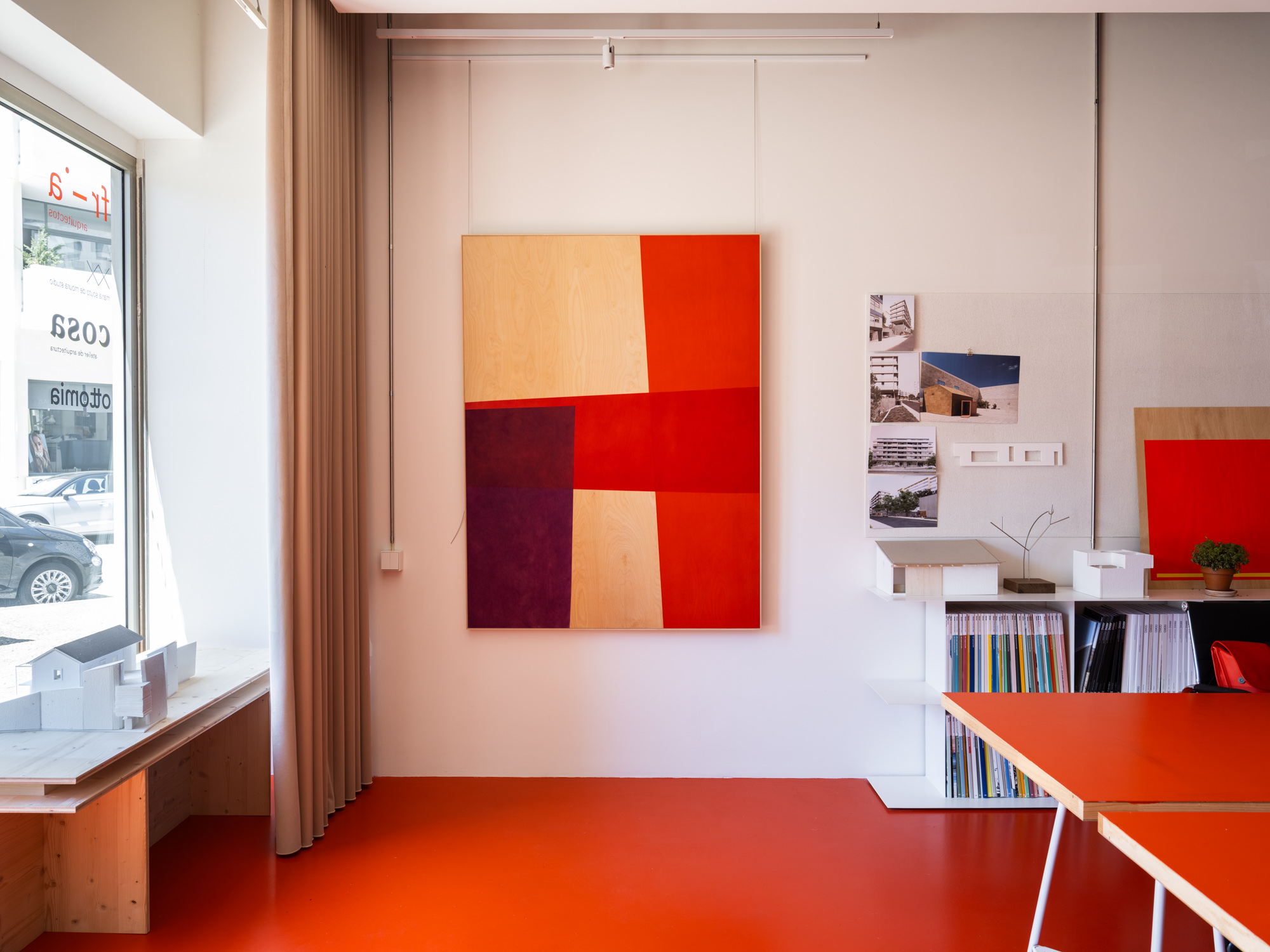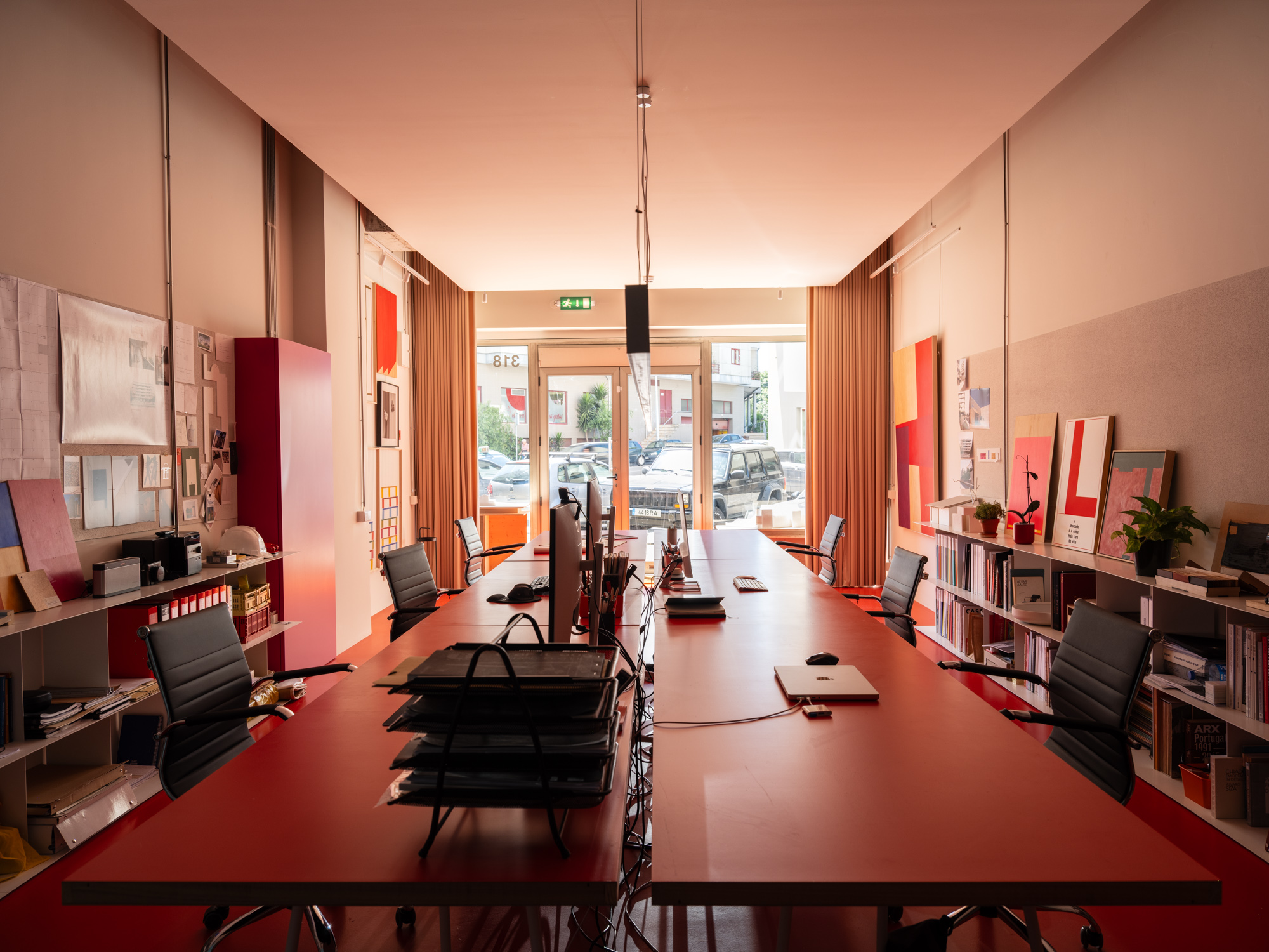 Um teto falso cénico que não toca nos limites do espaço e permite a passagem da instalação elétrica exterior. Um chão em resina com uma cor que remete para a identidade do atelier. Estantes brancas em aço a ladear as duas paredes longitudinais. Ao fundo uma caixa azul interrompe o espaço retangular branco. No interior mergulha-se no amarelo intenso da copa e da instalação sanitária para nos esquecermos de que estamos num espaço de trabalho.