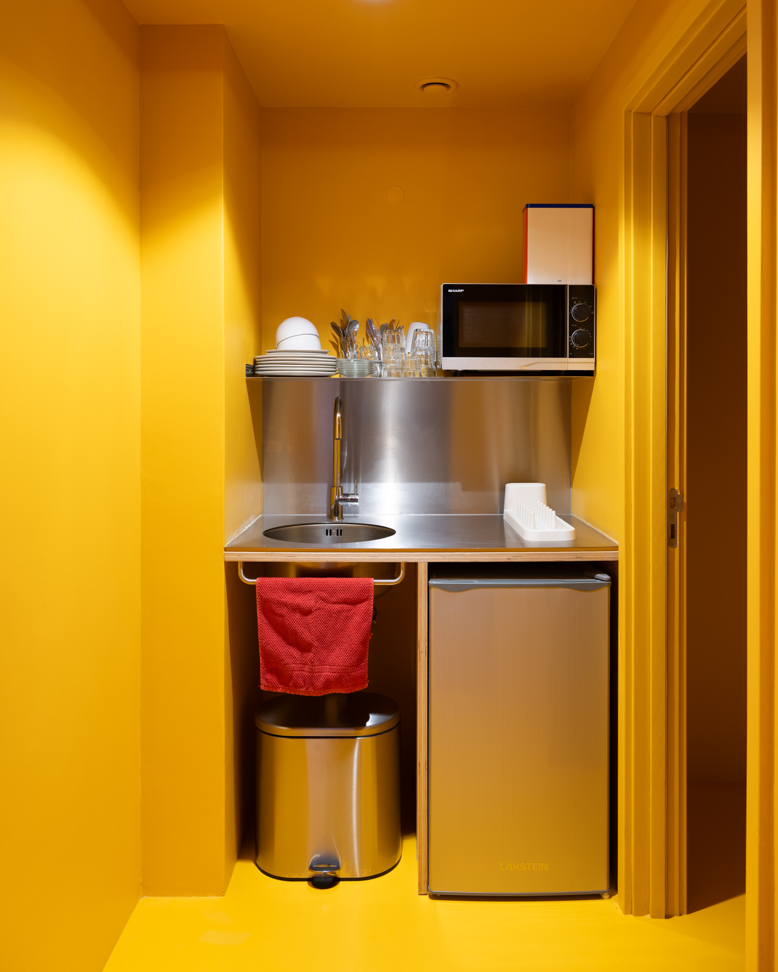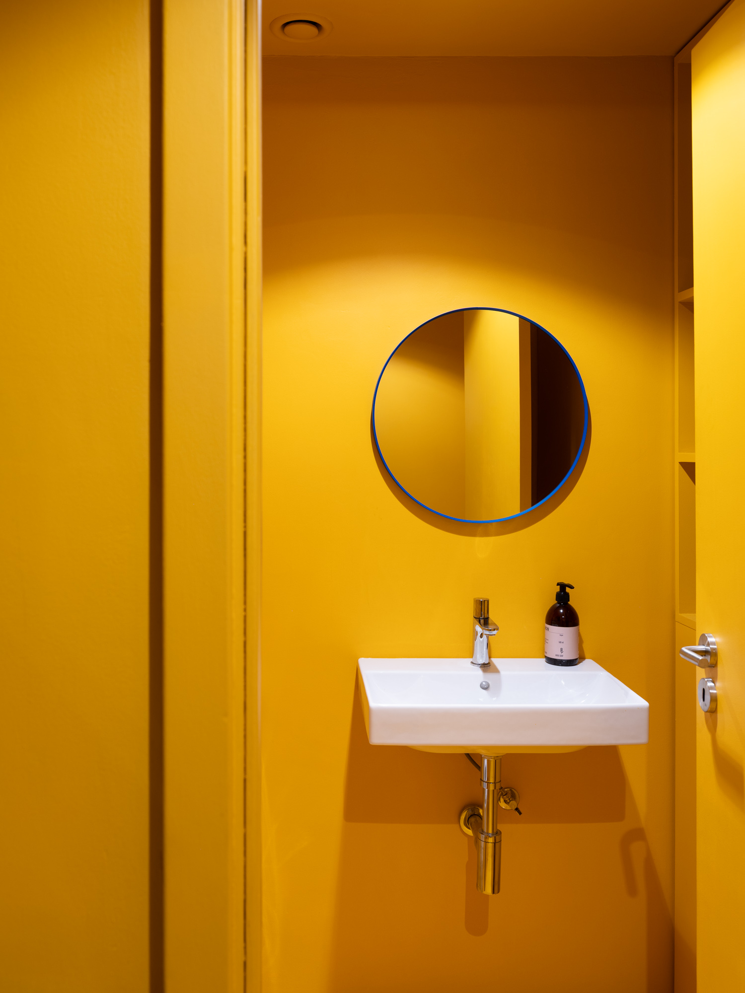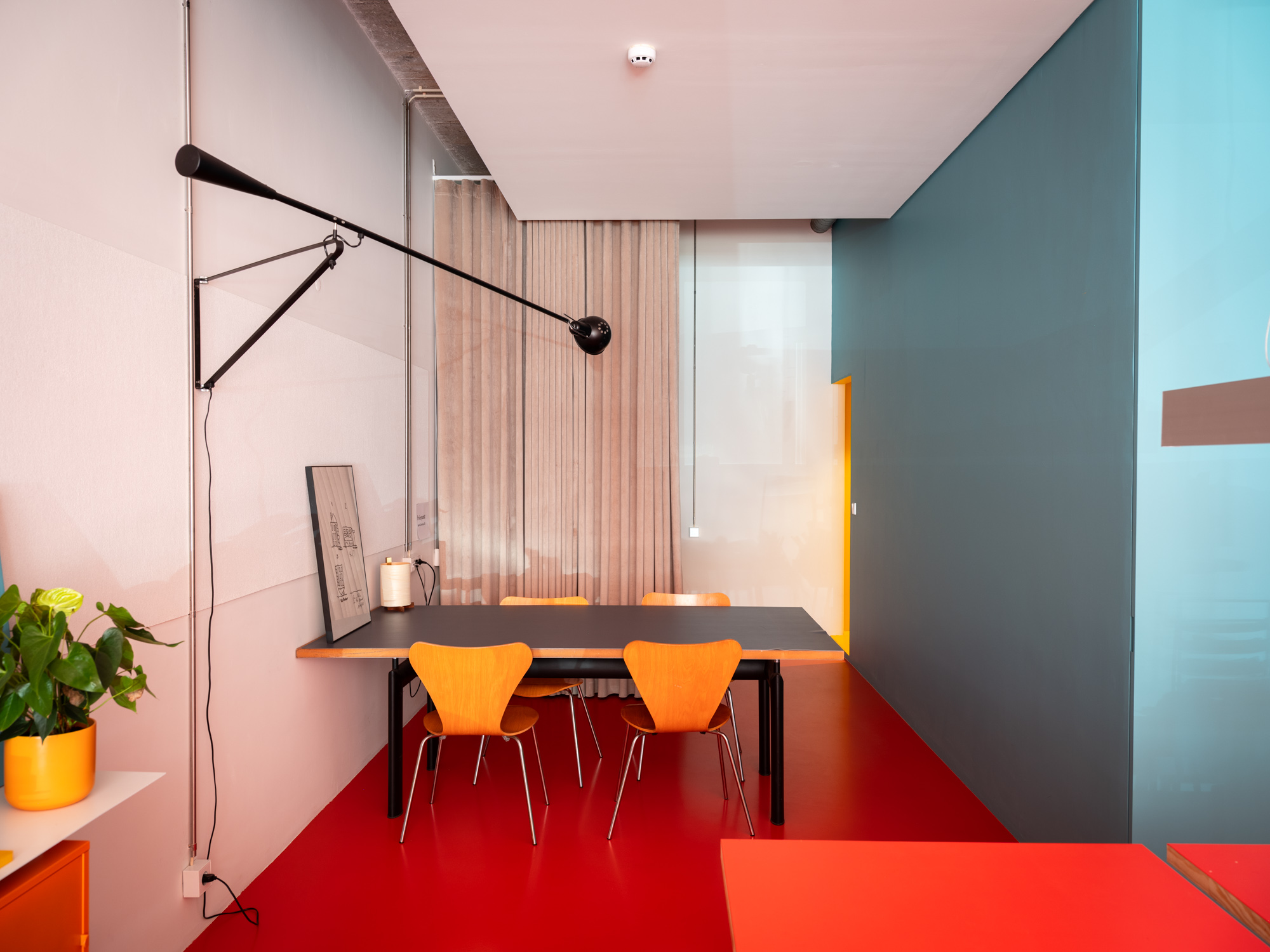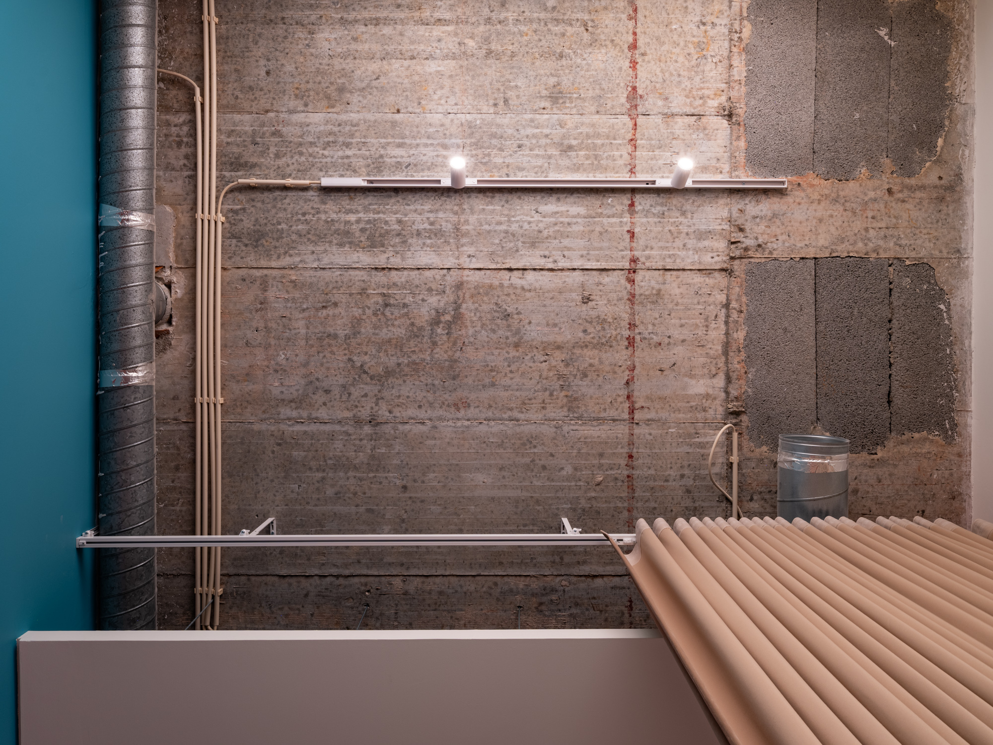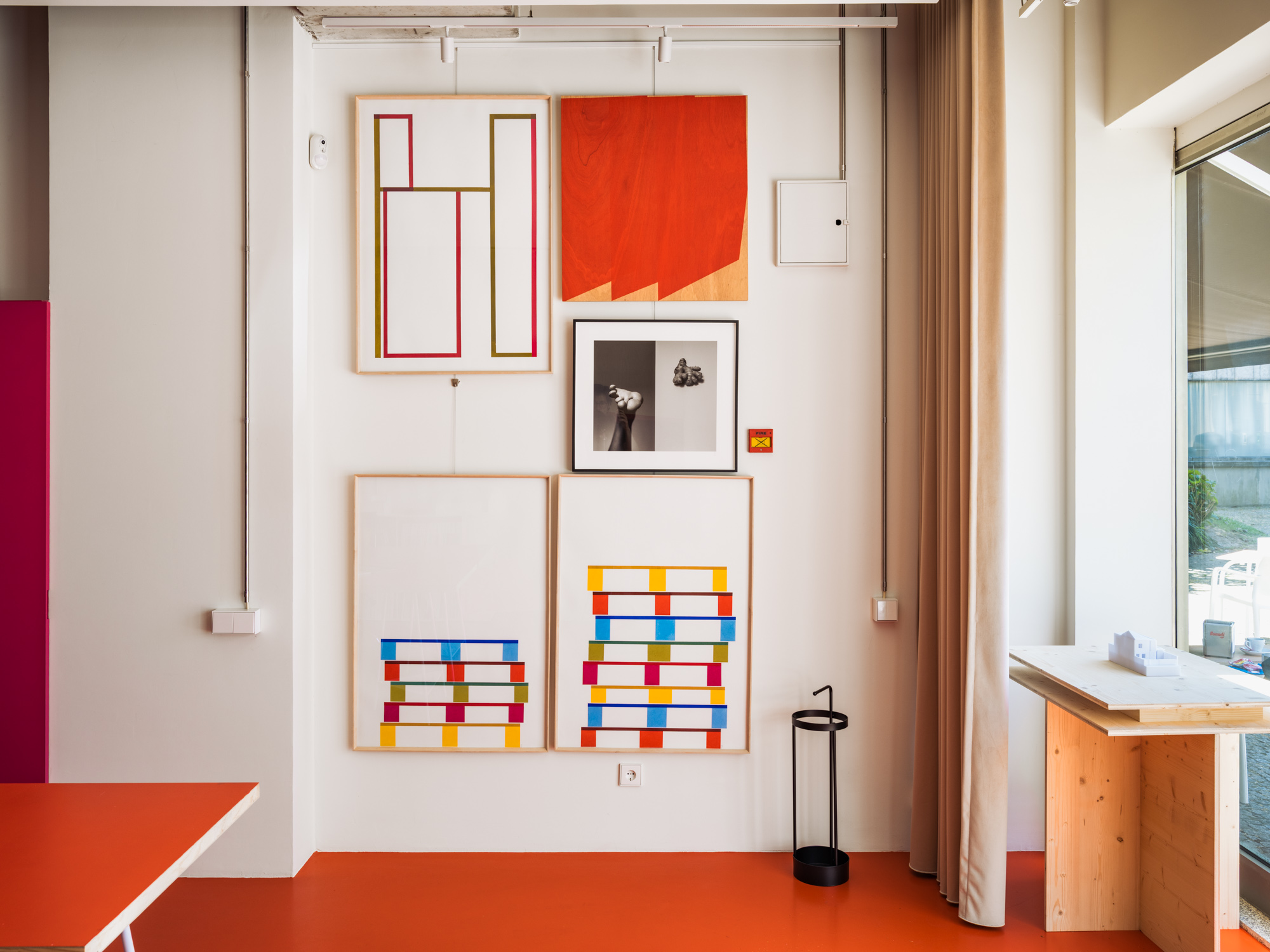 Um teto falso cénico que não toca nos limites do espaço e permite a passagem da instalação elétrica exterior. Um chão em resina com uma cor que remete para a identidade do atelier. Estantes brancas em aço a ladear as duas paredes longitudinais. Ao fundo uma caixa azul interrompe o espaço retangular branco. No interior mergulha-se no amarelo intenso da copa e da instalação sanitária para nos esquecermos de que estamos num espaço de trabalho.