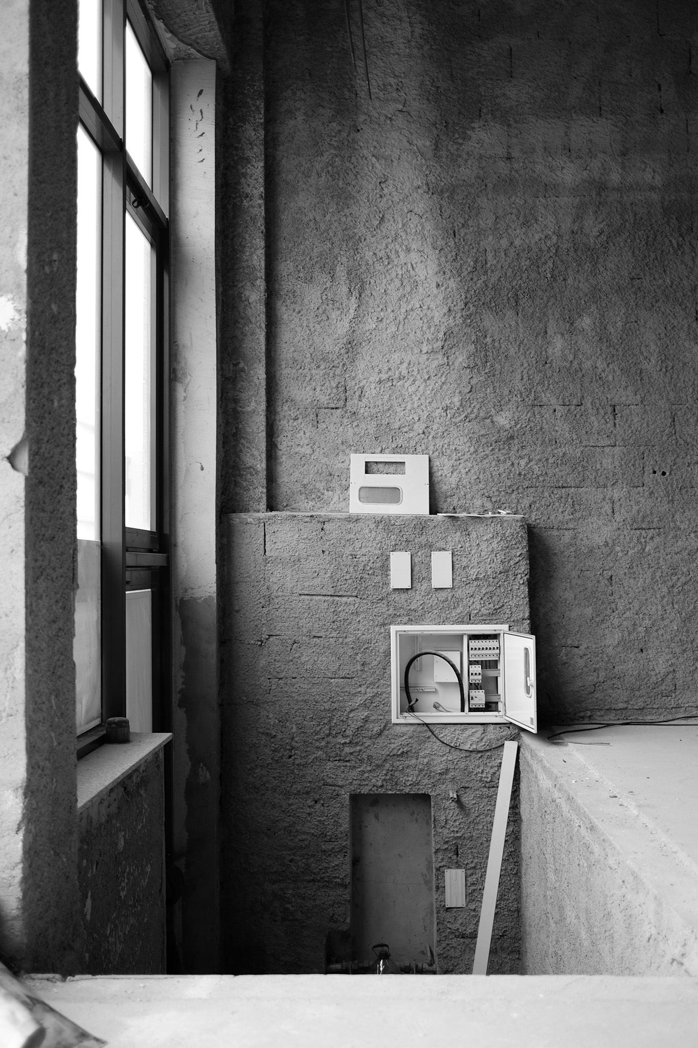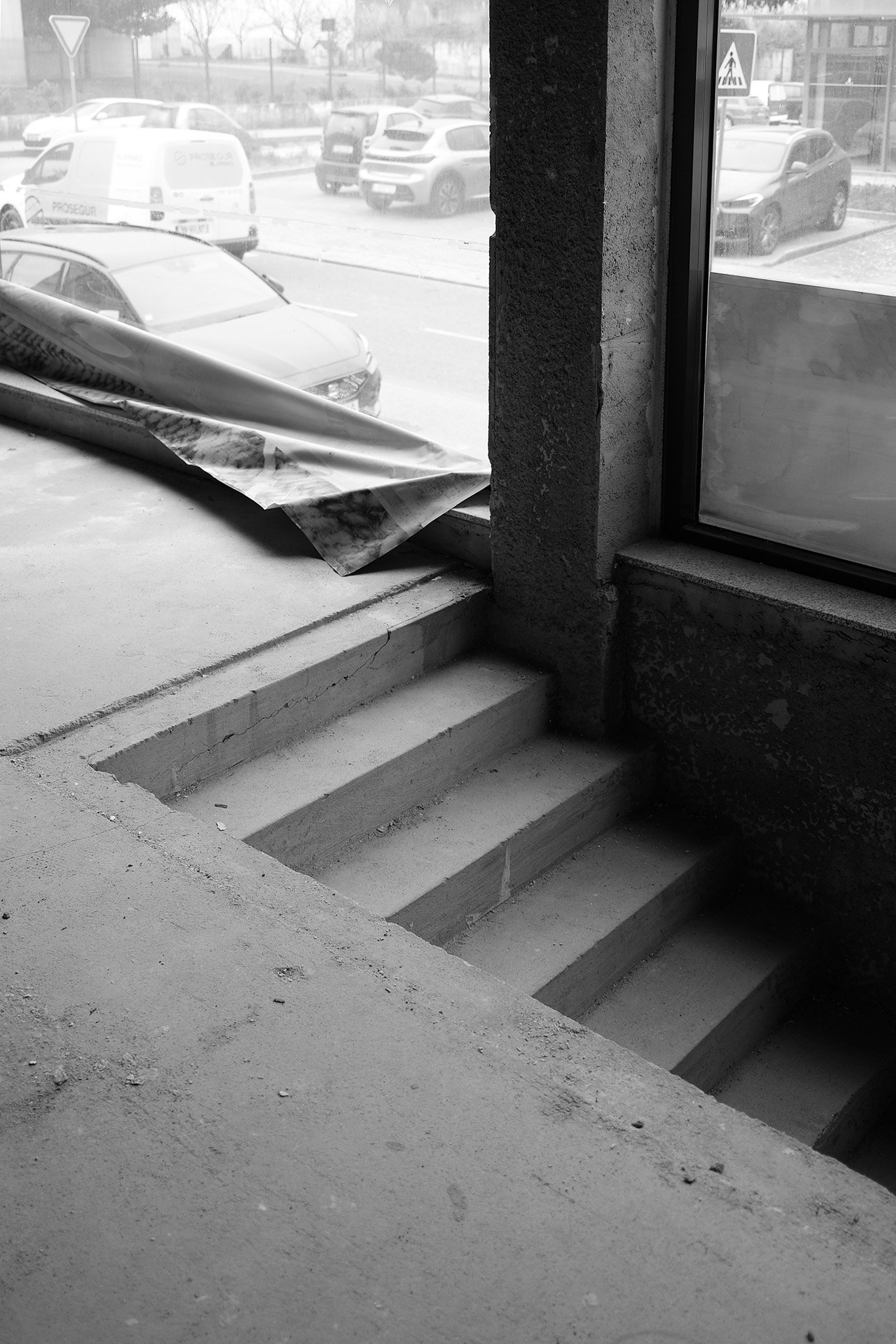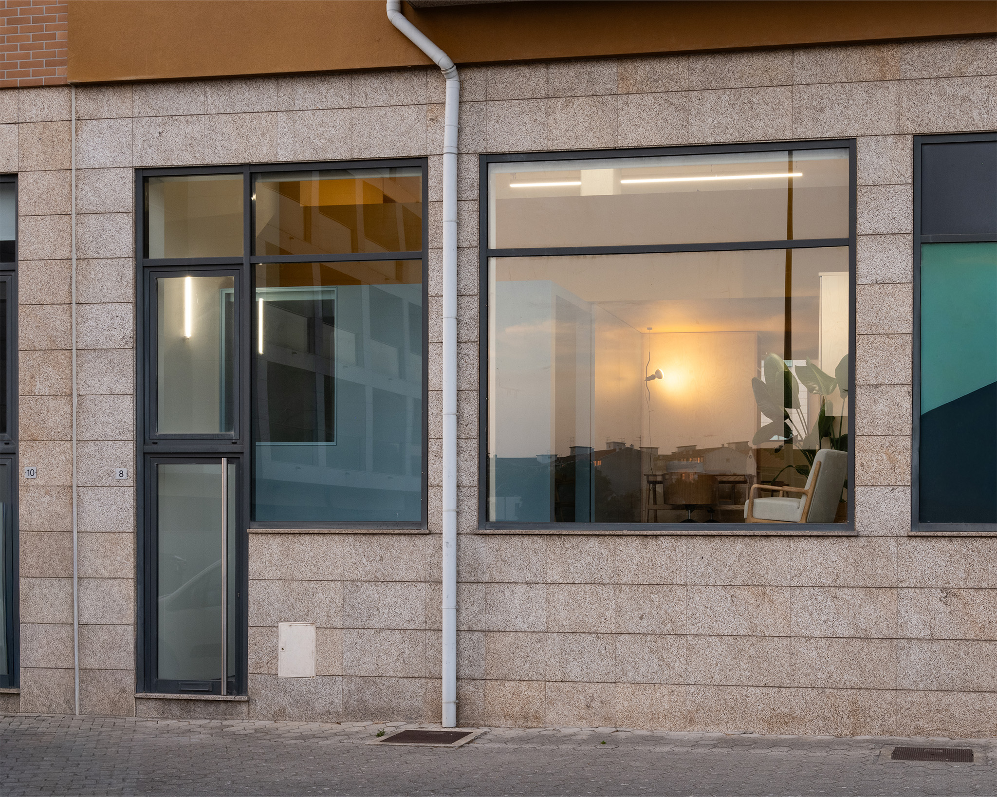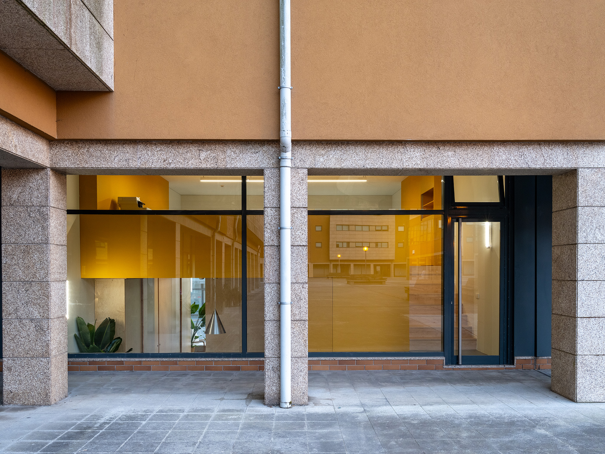Um escritório para um espaço existente vazio. Duas frentes com duas entradas, a diferentes cotas e um pilar central.