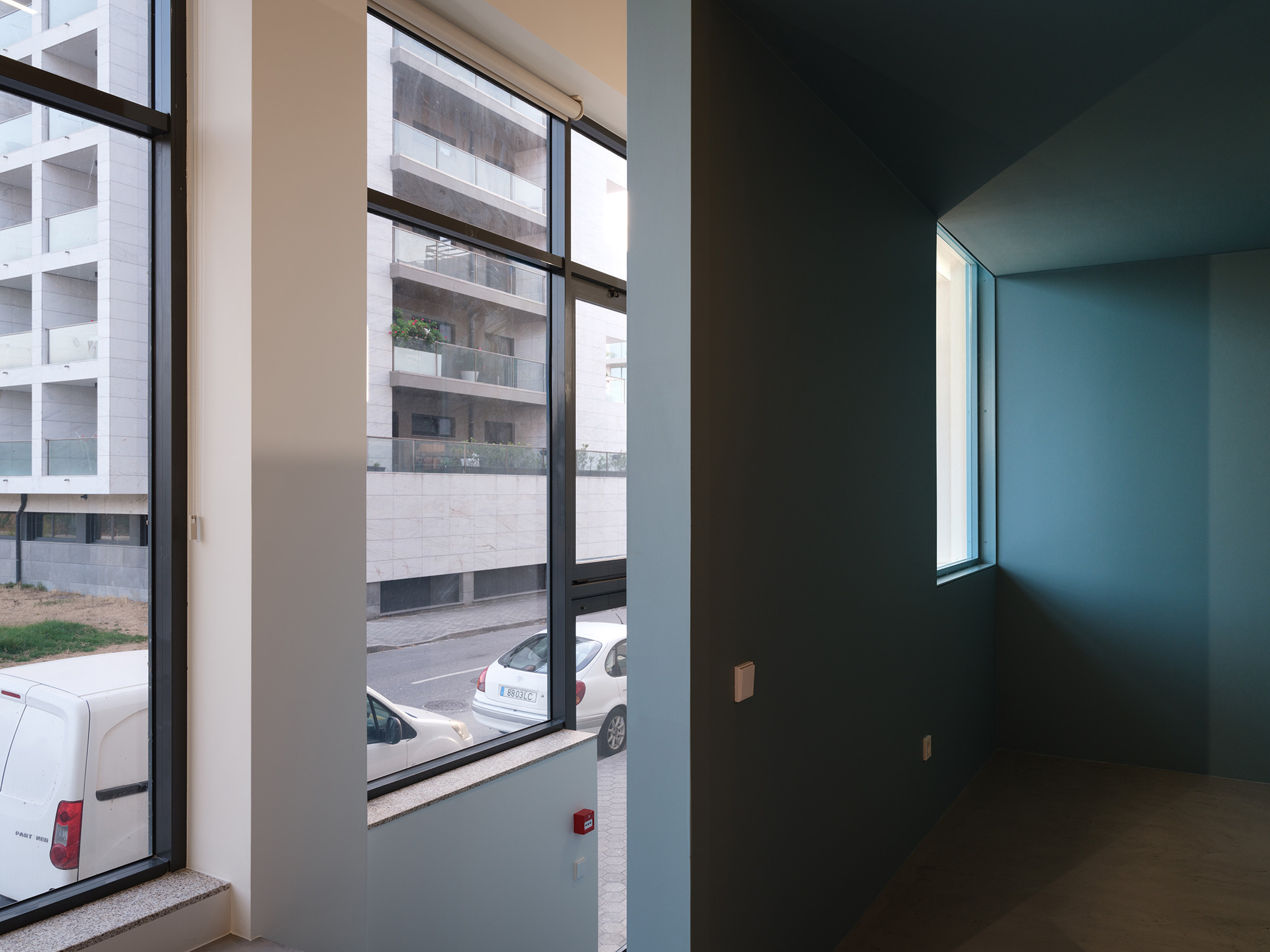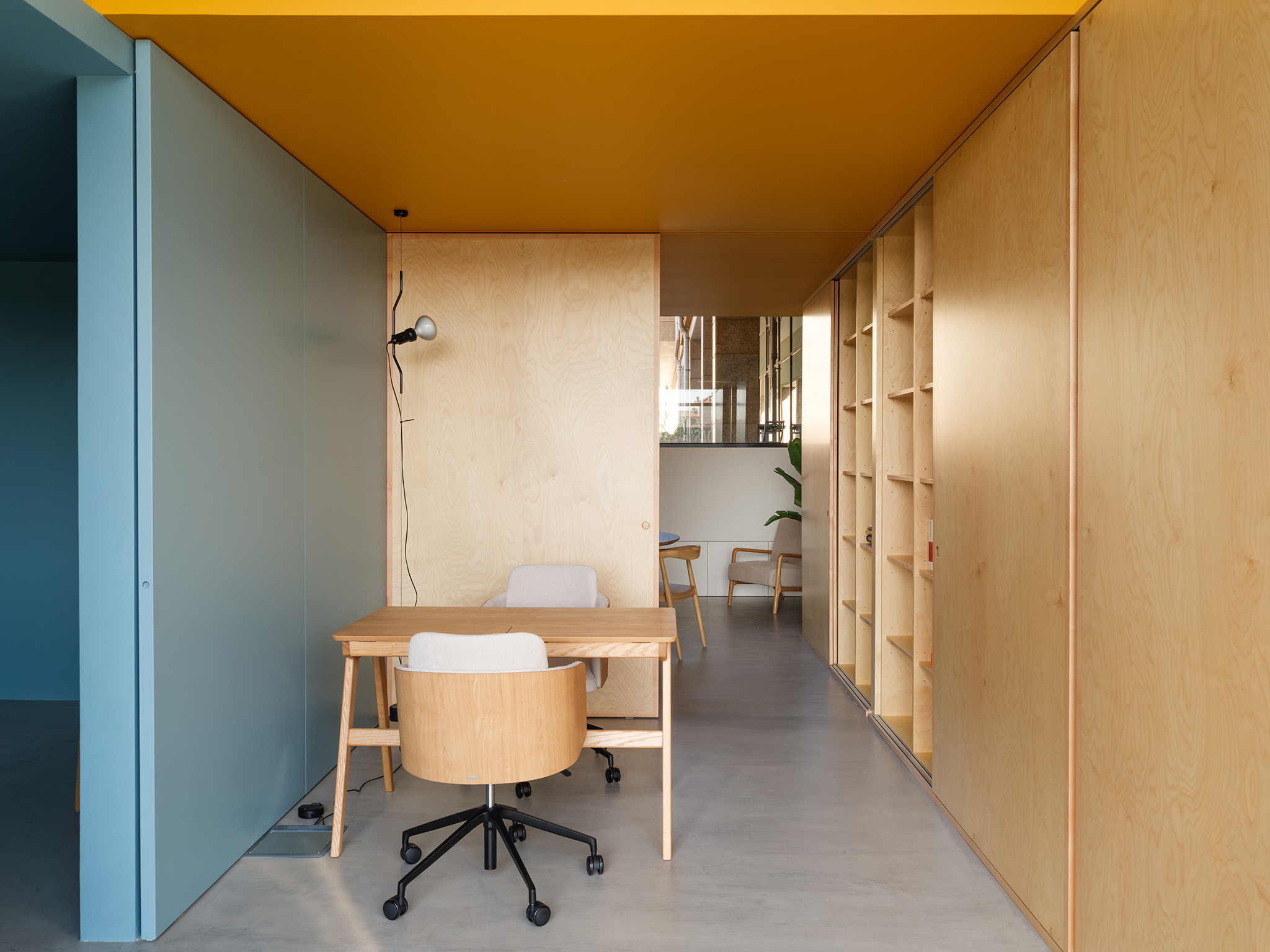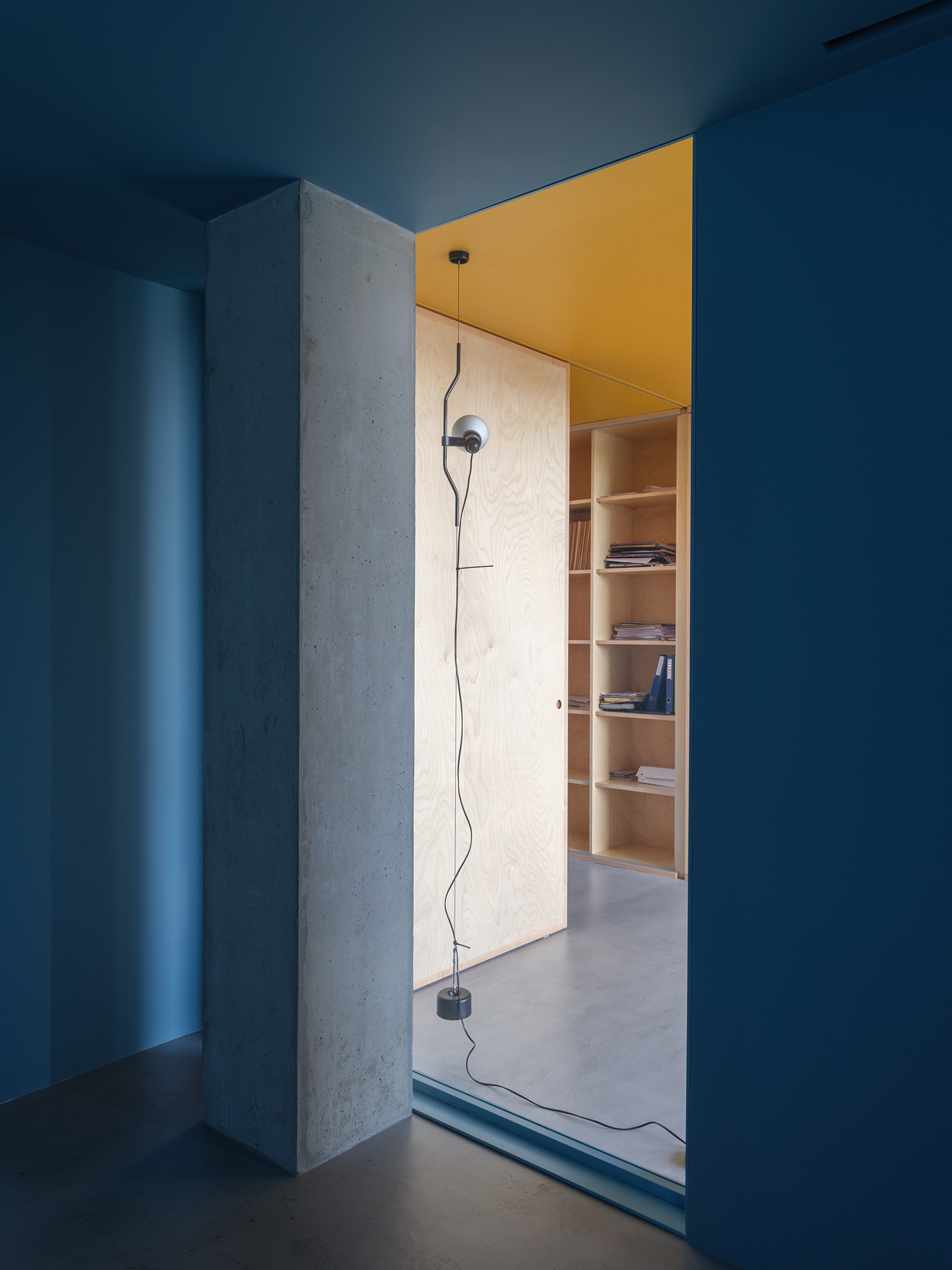 O máximo de luz natural e fluidez espacial. Cores que definem cada um dos elementos da composição e um pilar de betão que os atravessa.
