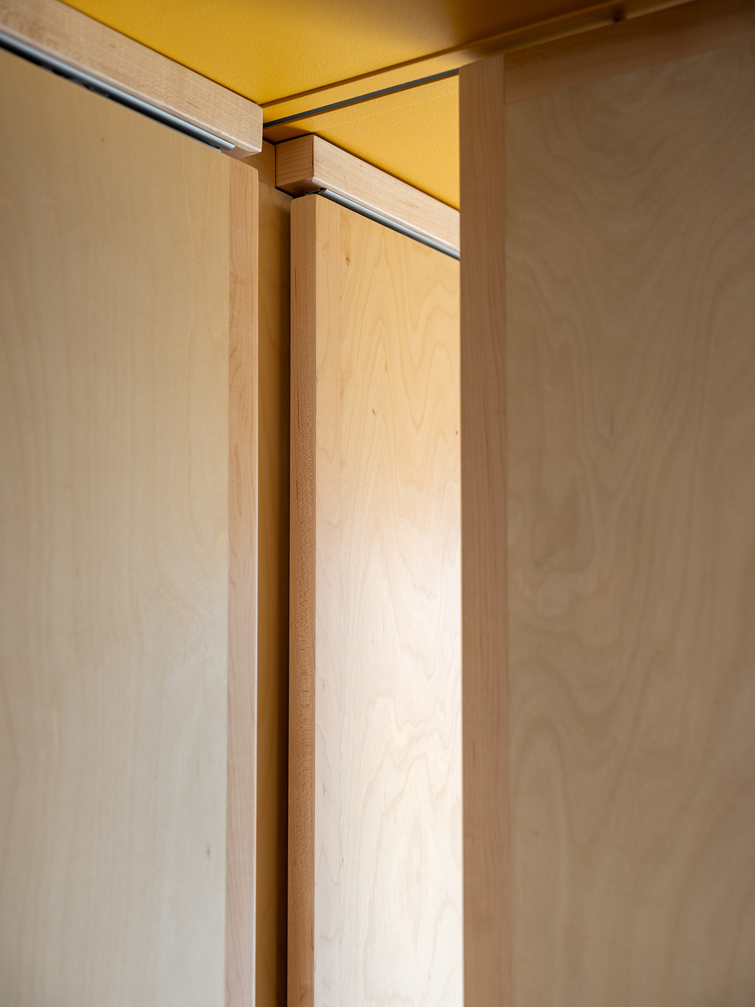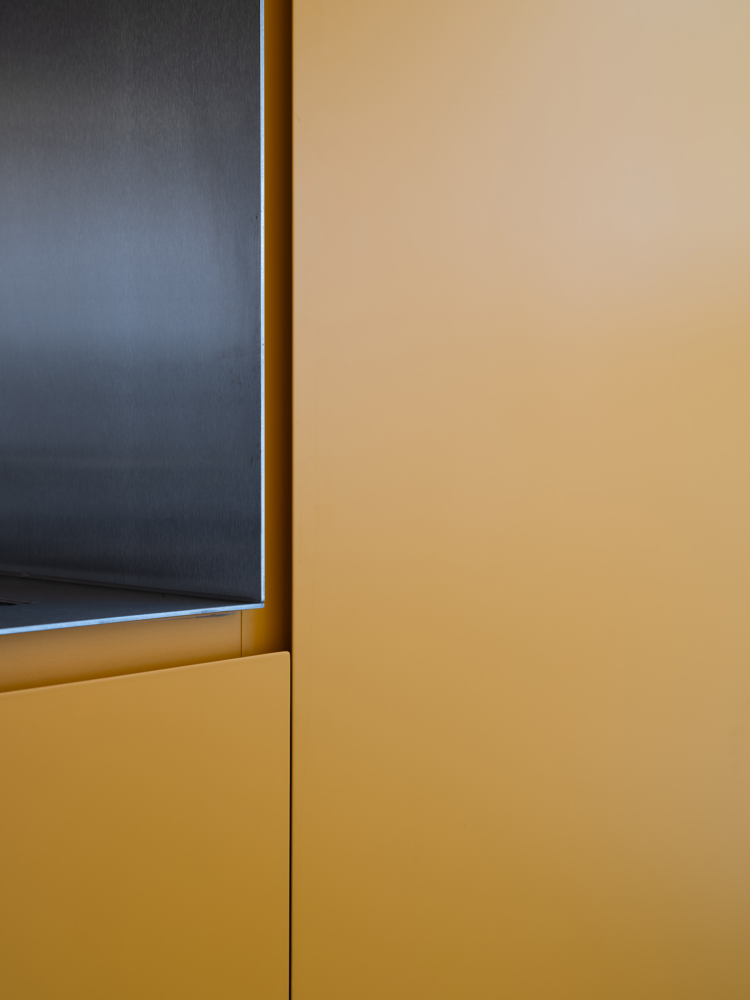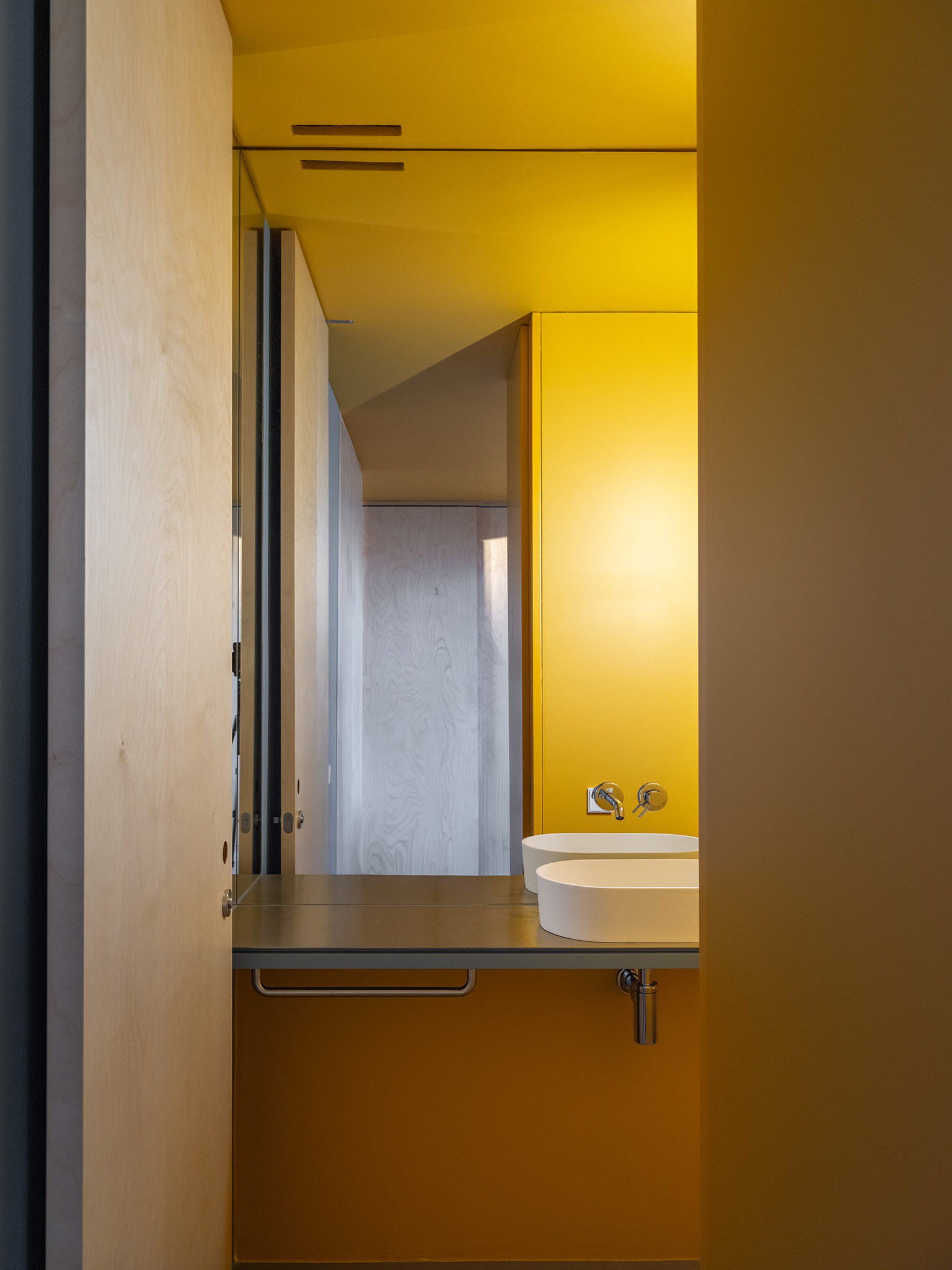 O máximo de luz natural e fluidez espacial. Cores que definem cada um dos elementos da composição e um pilar de betão que os atravessa.