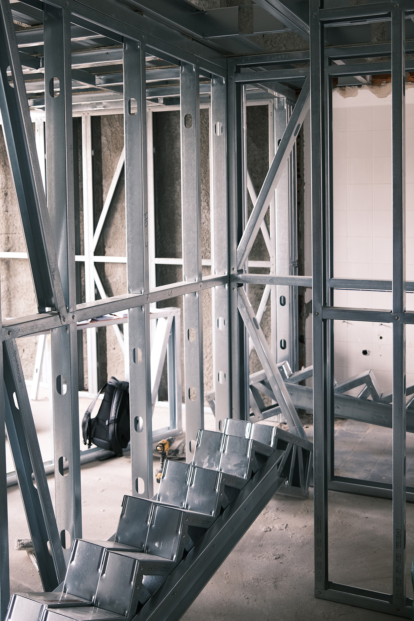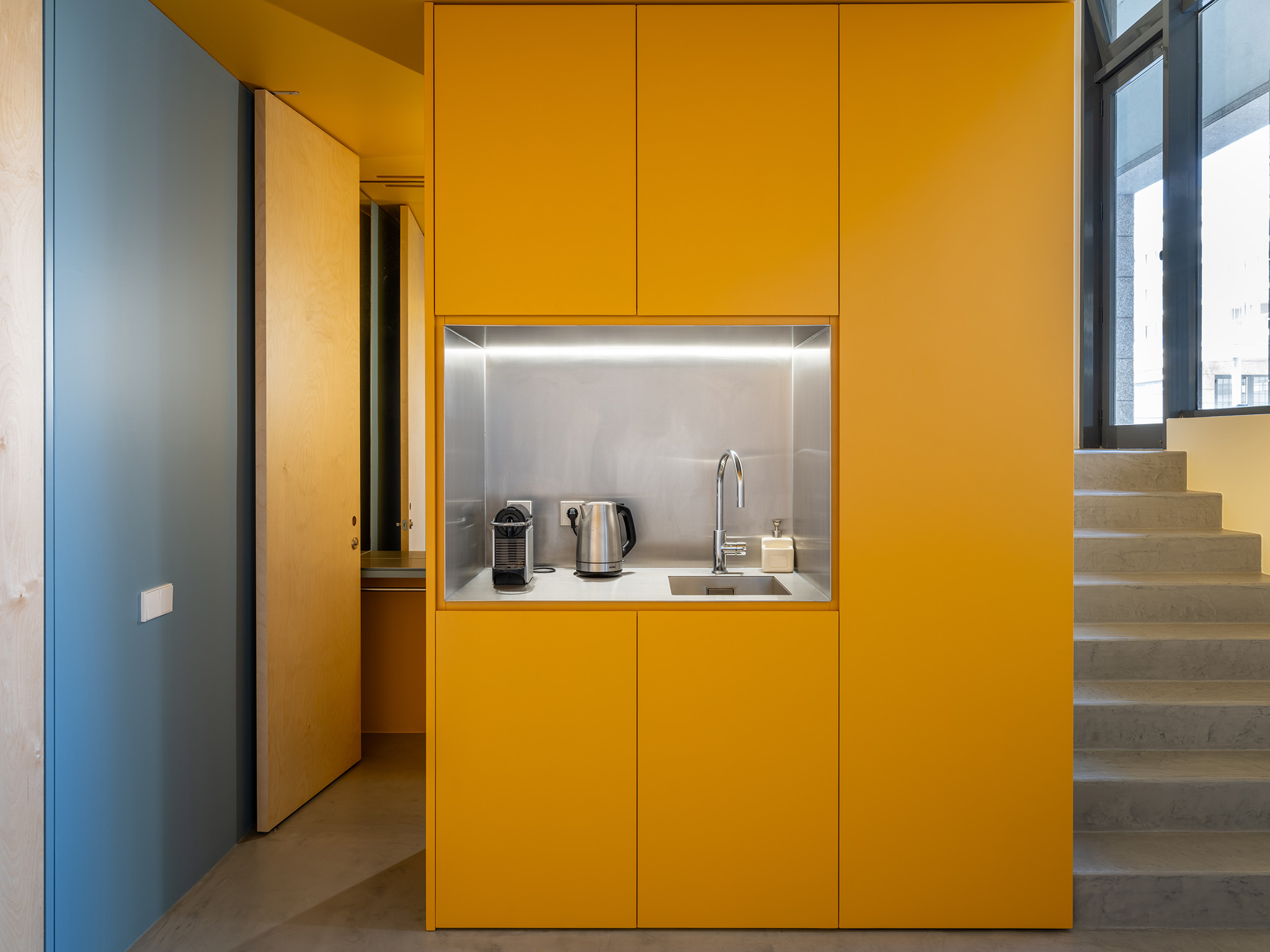 A estratégia: ocupação do espaço com elementos ligeiros e flexíveis como armários e portas de correr. Uma caixa para reuniões. Uma mezzanine pousada sobre a caixa como espaço de trabalho.